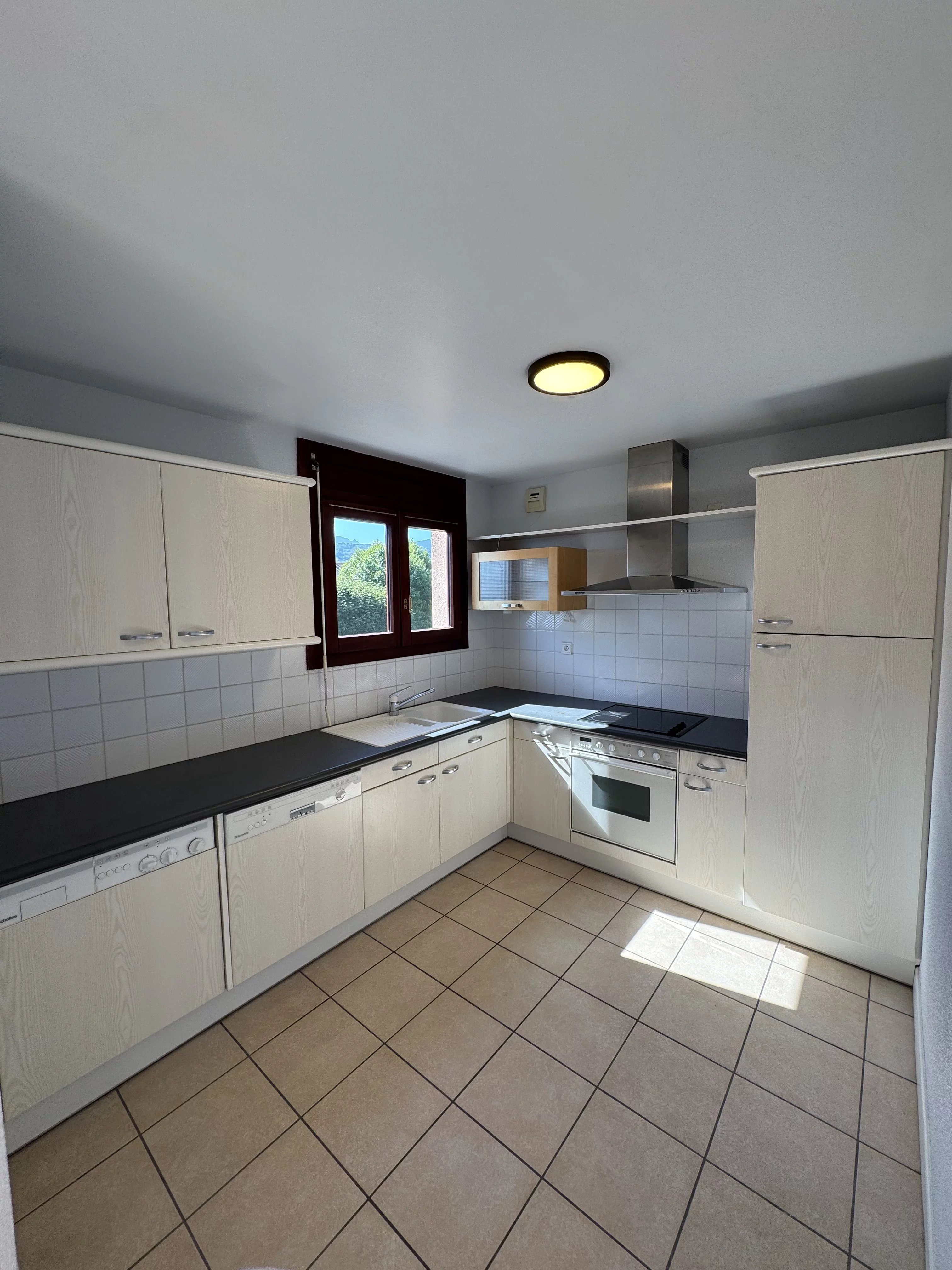 Un grand séjour avec balcon exposé Nord et un balcon exposé Ouest, une cuisine équipée avec frigo, un congélateur, une hotte, une plaque de cuisson vitrocéramique, un four, un lave-vaisselle et un lave linge.
